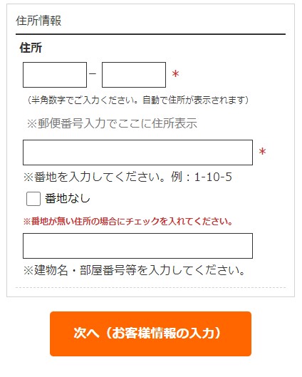 ●郵便番号の入力で住所を自動表示します。番地の入力をお願いします。